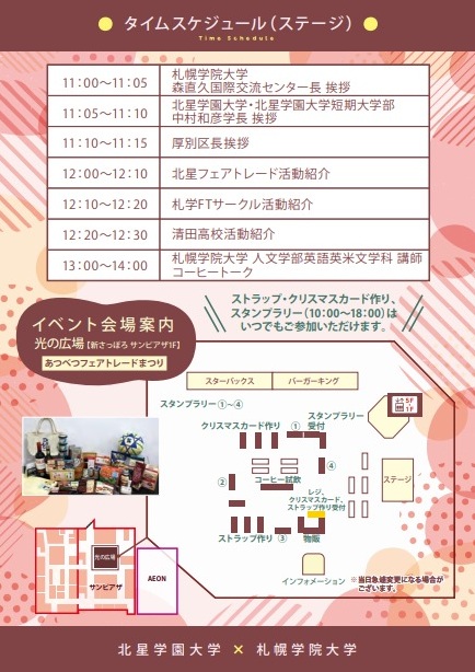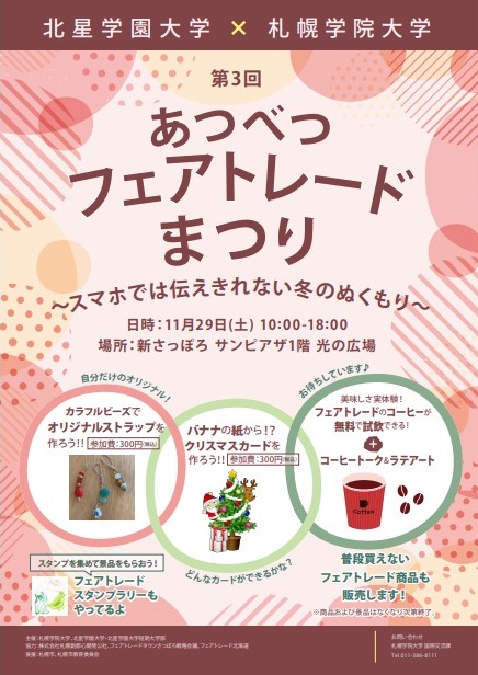 11月29日(土)北星学園大学と札幌学院大学が「第3回 あつべつフェアトレードまつり ~スマホでは伝えきれない冬のぬくもり~」を共催します。